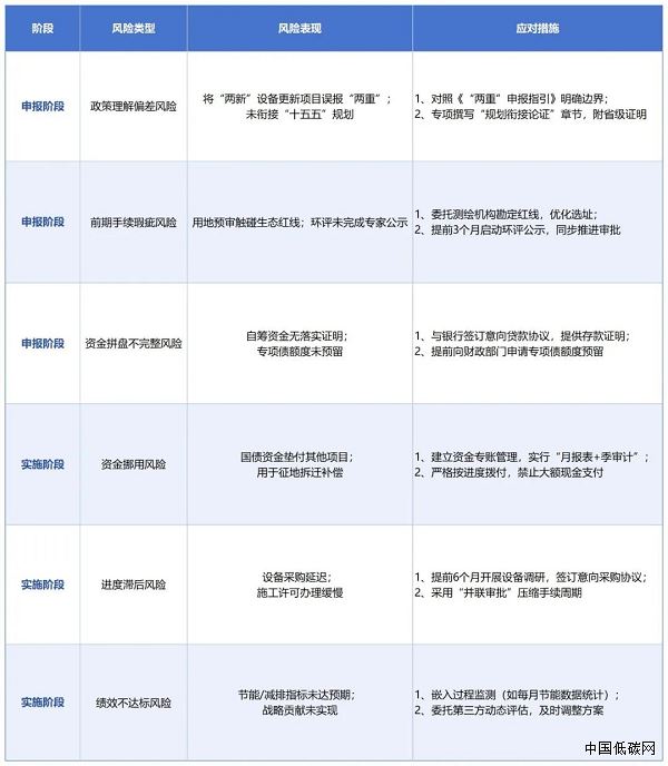 1、政策理解偏差風險:誤將“兩新”領域設備更新項目納入“兩重”申報。應對:對照國家發改委《2025年“兩重”項目申報指引》,結合2026年補充通知,明確“兩重”與“兩新”的邊界(“兩新”側重消費端升級,“兩重”側重戰略端保障);