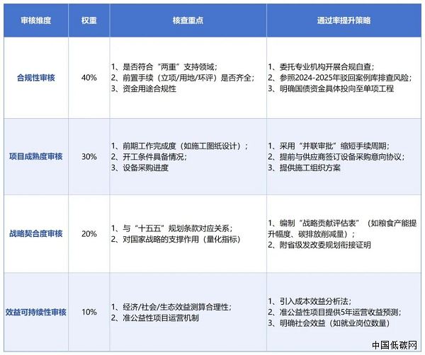 1、合規性審核(權重40%):重點核查投向領域、前置手續、資金用途三大合規性。攻堅策略:委托專業機構開展合規性自查,參照2025年駁回案例庫(如房地產關聯項目、樓堂館所項目)進行風險排查;